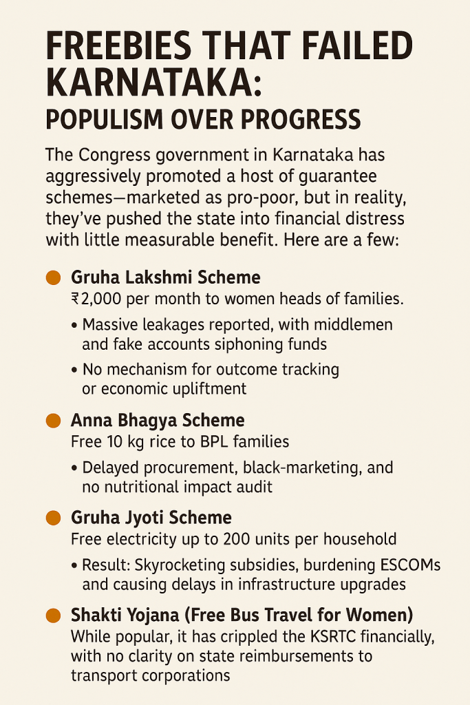 But the reality is stark—mismanagement and populist giveaways have drained the state treasury. Rather than strategic investments, funds are being funneled into vote-bank schemes that lack planning and sustainability. The people of Karnataka are paying the price while the administration remains focused on electoral optics and press conferences.